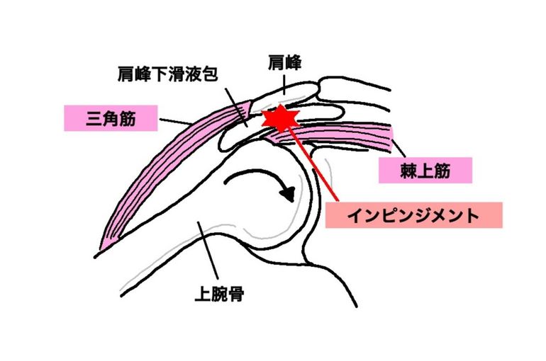 内旋したまま上げようとすると、棘上筋の腱が肩峰と上腕骨の間に腱がはさまれてしまい、そのうち腱が部分断裂を起こしてしまいます。